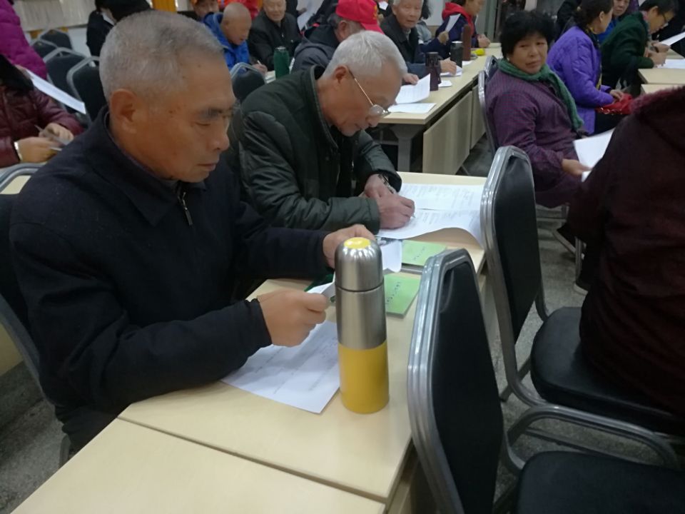 志愿者和居民代表认真填写《争创全国文明城市市民应知应会试卷》,共同学习创城知识。