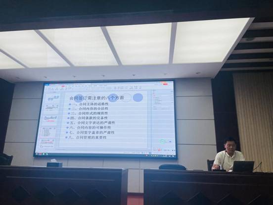 第二项开展“我讲我业务”活动:由法务部副部长杨军同志根据工作实践为大家生动讲解了《合同法》相关内容,并开展随堂测试。